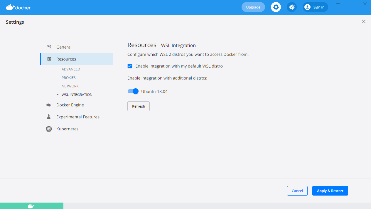 다음과 같이 설정 -> Resources -> WSL INTEGRATION에서 사용하는 WSL 버전을 Enable 해주면 된다.