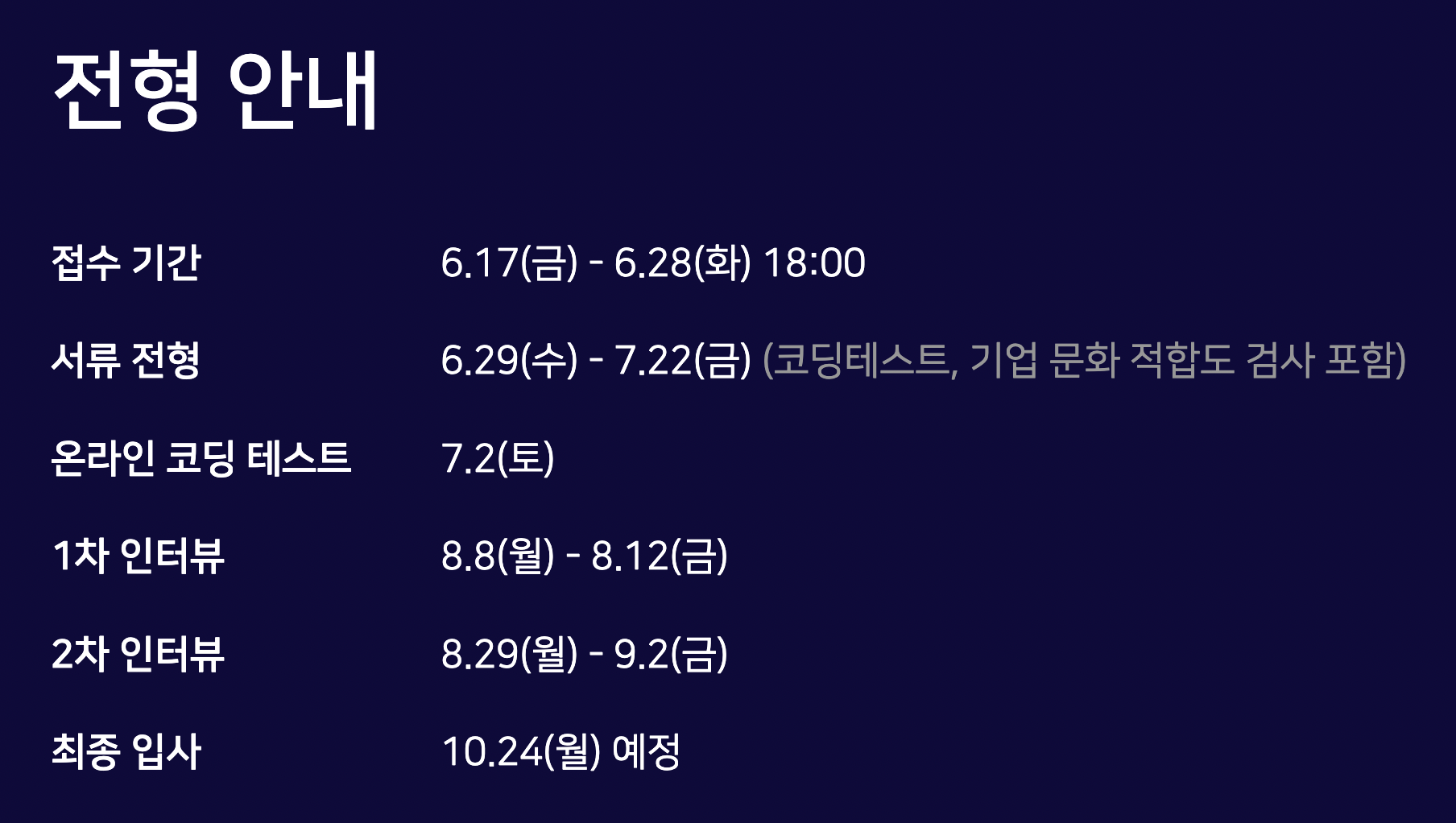 CS는 카카오 인턴에서 준비하던 방식과 동일하게 진행했고, 수리력 및 손코딩의 경우 아는 분에게 받은 유사 문항 + 유사 문항을 기반으로 추가한 문제들로 준비했고, 면접 3일 전부터는 인당 60분씩 실제 면접 분위기로 모의 면접까지 진행했다.
